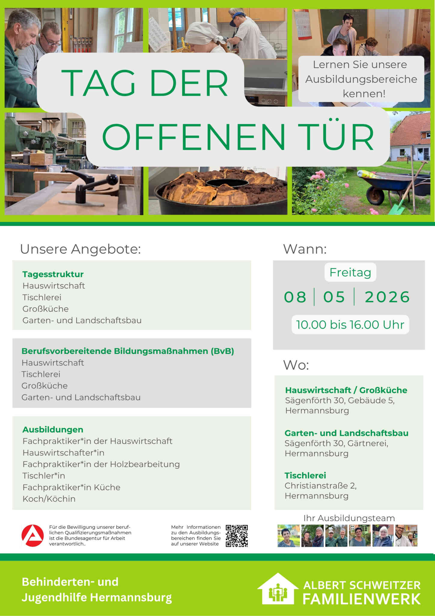 Hermannsburg: Mit einem Tag der offenen Tür informiert unser Ausbildungsbereich auch in diesem Jahr wieder über die verschiedenen Möglichkeiten der Beruflichen Qualifizierung. Alle Interessierten sind am Freitag, 8. Mai in der Zeit von 10 – 16 Uhr recht herzlich dazu eingeladen.