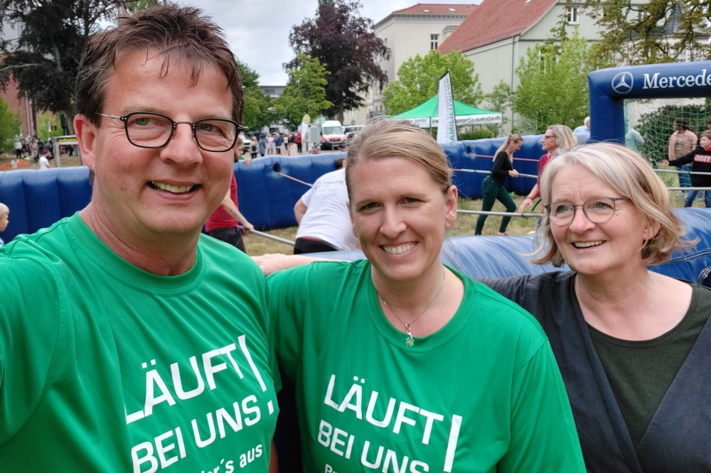 mit einem tollem Team und dem Menschenkicker dabei. Von links: Jörg Grabowsky, Nadja Fischer und Susanne von Zimmermann – nicht im Bild: Stina Junker.