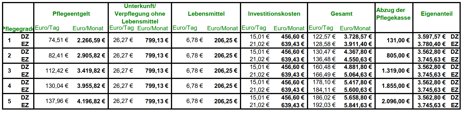 Sämtliche Mahlzeiten, wie Zwischenmahlzeiten, Nachmittagskaffee, Obst und „normale“ Sonderwünsche werden nicht zusätzlich berechnet. Auch sämtliche Getränke (mit Ausnahme Alkoholika) sind bereits im Pflegeentgelt enthalten.